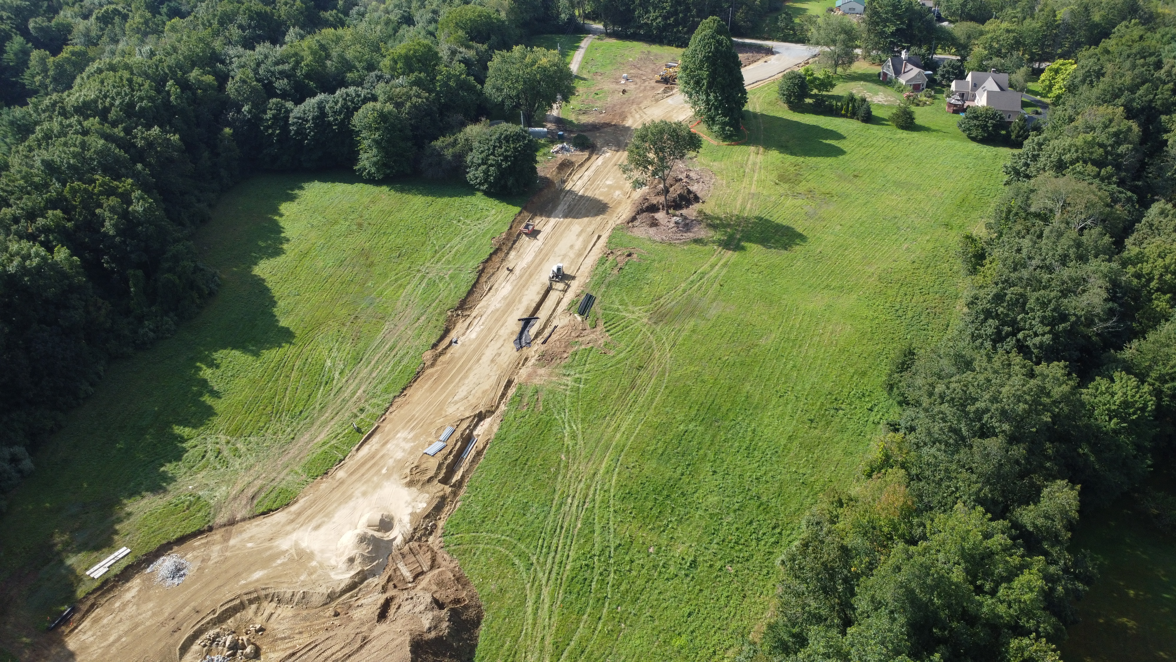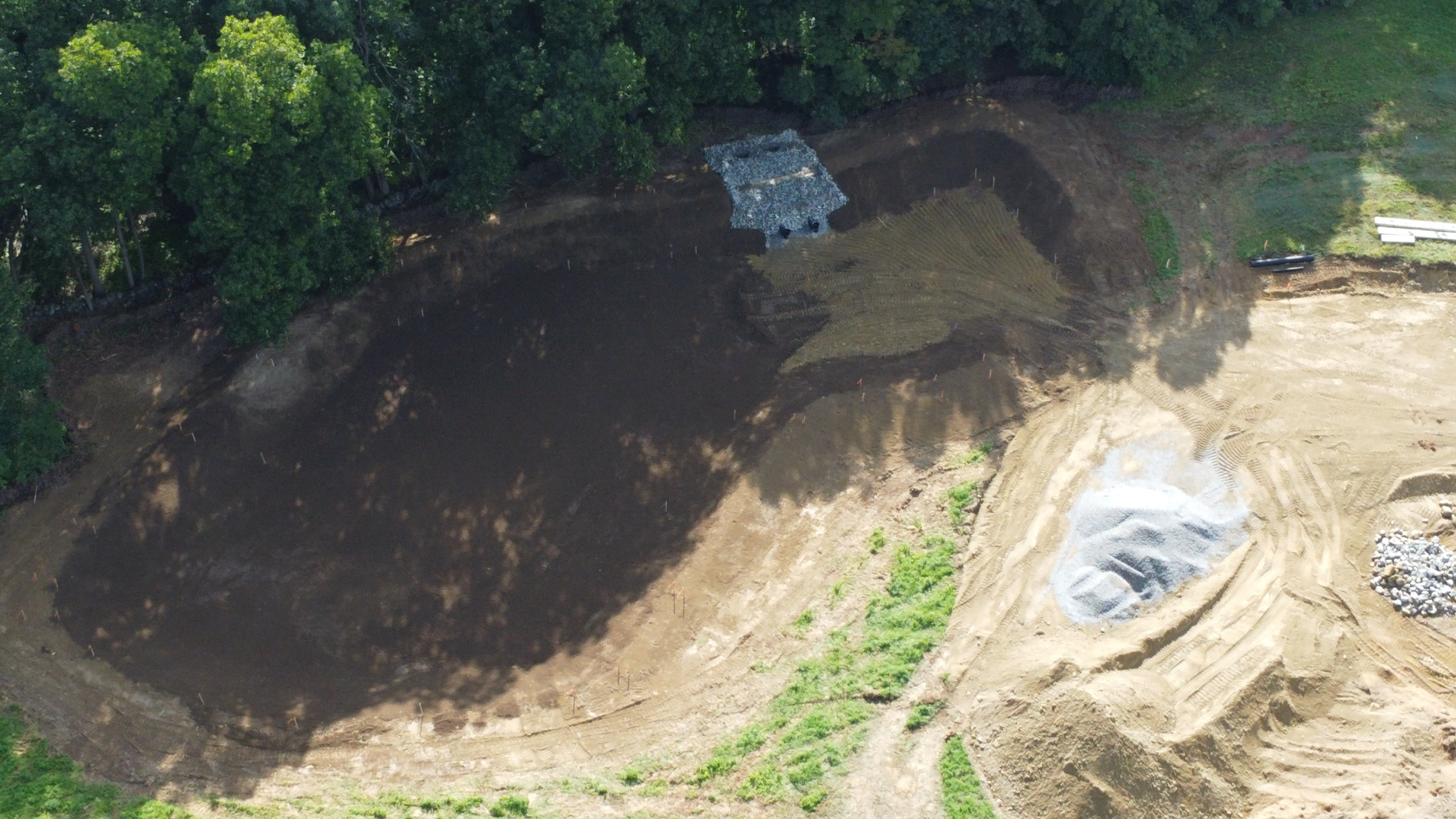 Spillway looks about done, with two drainage pipes and starting to fill with sand.